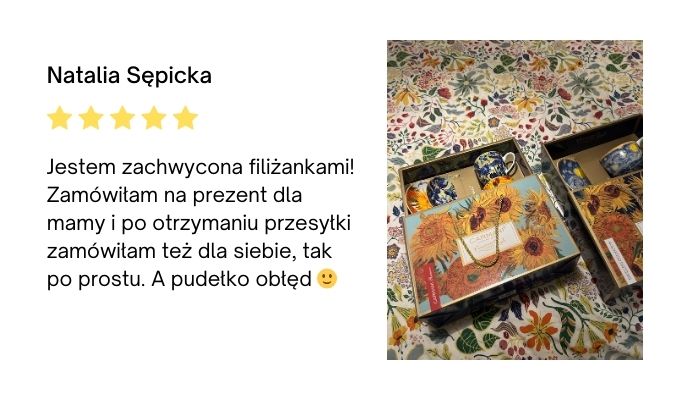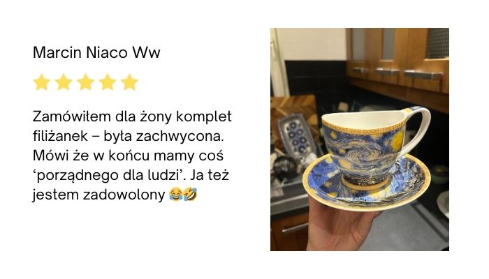 Ten kubek to wyjątkowe połączenie klasycznej elegancji i artystycznego charakteru. Starannie wykonany, z dbałością o każdy detal, zachwyca zarówno formą, jak i unikalnym zdobieniem inspirowanym malarstwem Van Gogha.